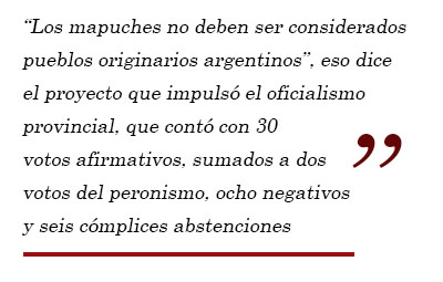 “Los mapuches no deben ser considerados pueblos originarios argentinos”, eso dice la iniciativa del proyecto que impulsó el oficialismo provincial, que contó con 30 votos afirmativos, sumados a dos votos del peronismo, ocho negativos, y la complicidad de seis abstenciones (cinco peronistas) y cuatro ausencias.