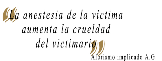 La crueldad es la violencia que interrumpe el devenir amoroso de la vida. Del amor al terror. Pero es la víctima, alienada en los mandatos de la cultura represora, que no solamente sigue amando a su ángel exterminador, sino que además no puede aprender a odiarlo. La anestesia de su legítima violencia, que es además el ejercicio de su legítima defensa, es una sentencia firme de muerte. La obsesión de no culpabilizar a la víctima impide que la víctima salga de ese lugar letal. El victimario, torturador, exterminador, no va a dejar de asesinar aunque lea todas las noches el código penal y todas las tardes las leyes contra la violencia de género.
