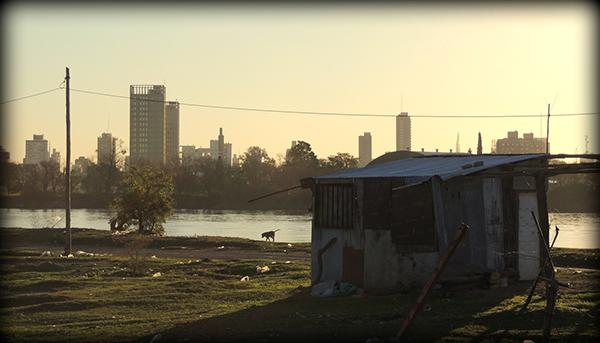 La frontera que separa las Santa Fe no es sólo una avenida, también es un riacho. Un charco que constituye una traza, un margen, que configura un periplo interminable, inabordable, inaccesible, cuando se intenta cruzar al otro lado.  Por eso los dejan ahí, rodeados de agua y anclados en el barro, en la arena que no drena. Por eso la Municipalidad decide tirar un poco de escombros, de tanto en tanto, para que parezca que están pisando tierra firme y los aullidos se disipen.