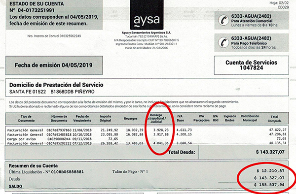 Sin embargo AySA aplicó su propia tarifa durante los últimos meses de 2018 y envió facturas impagables de más de $ 20.000. Después de varias reuniones con funcionarios de la empresa llegaron menores montos. Pero esas facturas devengadas son implacablemente sostenidas, con intereses acumulados y entregadas a estudios jurídicos que acechan como lobos hambrientos para sacar su propia tajada.