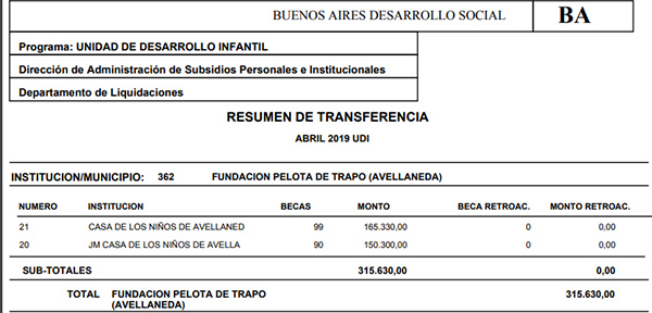 Hoy la deuda es de $ 143.327 y el saldo total supera los 155.000 pesos. El magro subsidio que recibe Casa de los Niños por parte del Estado para atender a 190 chicos y chicas es de $ 315.630: cada niño tiene una beca de $ 1.670 mensuales con los que la organización debe garantizar la comida, la educación y su salud.