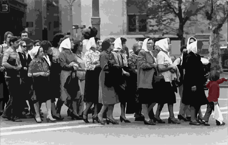 Circulen circulen. Decían las voces de hierro con armas largas colgadas de los hombros. Era el estado de sitio. Y nadie podía permanecer en grupo y de pie en las calles de esta tierra. Y ellas circularon. Ese círculo maldito definió que nunca nada volvería a ser igual para los asesinadores. El dictador las miraba desde arriba y hablaba de esas locas, el patriarca. Catorce mujeres con ovarios enormes pidiendo por hijos bajo una dictadura feroz no podían ser otra cosa que locas. Hormonales o psiquiátricas. Como ven los patriarcas a las mujeres.