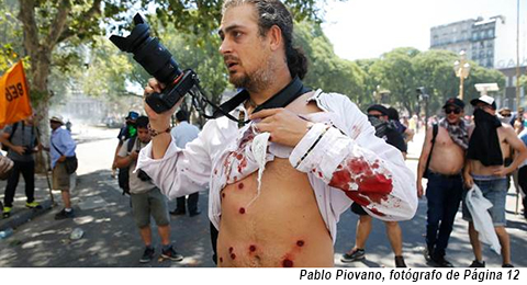 La imagen del fotógrafo Pablo Piovano –el mismo que hizo viajar en blanco y negro a las víctimas envenenadas del extractivismo- con catorce disparos en el cuerpo, sangrante e insistiendo con su cámara pertinaz, es lo más parecido a un símbolo. Las fuerzas de inseguridad han profundizado, en los últimos tiempos, su trabajo original para el que las formó el Estado: la aniquilación de cualquier chispa de rebeldía ante lo establecido. Que está establecido por millones de votos, acunado por los poderes económicos y por los propietarios de la tierra y el cielo, impulsado por los peores gajos de la mandarina social, sostenido por todas las fuerzas represivas, aquellas que hace cuatro años no más se reivindicaban trabajadores y buscaban sindicalizarse para gestionar, entre otras cosas, que no haya huellas de los enfrentamientos por la espalda con armas de grueso calibre. Como las gomeras de Villa Mascardi.