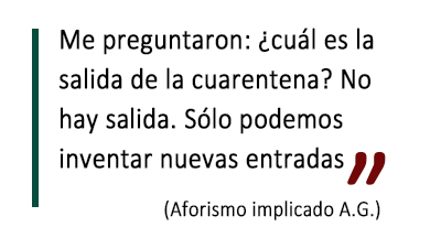 Entendamos antes que sea tarde. Bueno, ya lo es. Lo virtual existió siempre. Desde los sueños de los profetas. Pero era virtual justamente porque había realidad material. Lo virtual es pura abstracción. Una desmaterialización del humano en su mamífera realidad. Seguramente habrá placentas virtuales y reproducción robótica de nuevos humanoides. Nadie se acordará de los respiradores vinculares que una remota cooperativa en salud intentó desarrollar. Un control absoluto, un panóptico infinito, un Gran Hermano infinito. Eso he descubierto. El covid 1984. Voy a ser sincero, al menos una vez. Comparto este descubrimiento con George Orwell. Ahora trabajemos en neutralizarlo. En destruir los laboratorios donde se genera. Mi laboratorio acabo de destruirlo al escribir este texto. La resistencia al represor continúa.