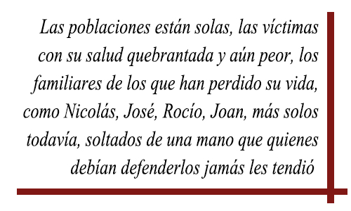 Las poblaciones están solas, las víctimas con su salud quebrantada y aún peor, los familiares de los que han perdido su vida, como Nicolás, José, Rocío, Joan, más solos todavía, soltados de una mano que quienes debían defenderlos jamás les tendió y se encuentran ante un enemigo envalentonado que sigue sosteniendo –donde sea- que los venenos son casi tan inofensivos como “el agua con sal” o menos nocivos que el agua caliente del mate mañanero.