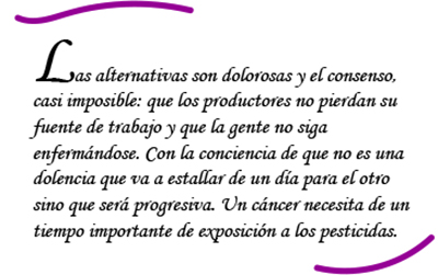 Como María Rosa Masson, a Silvina la vida le colocó un mojón de enfermedad familiar para despertarle la conciencia. “Uno de los que se descompuso en la fila de casas frente al campo fue mi tío. No podía respirar. Fui a los dos días a su casa y el olor a azufre seguía en el aire. Empecé a hablar con los vecinos y supe que todos vivían lo mismo y supe del cáncer”. En la casa lindera vive otro enfermo y su médico pide que cesen las fumigaciones que, por lo menos, le complican el tratamiento.
