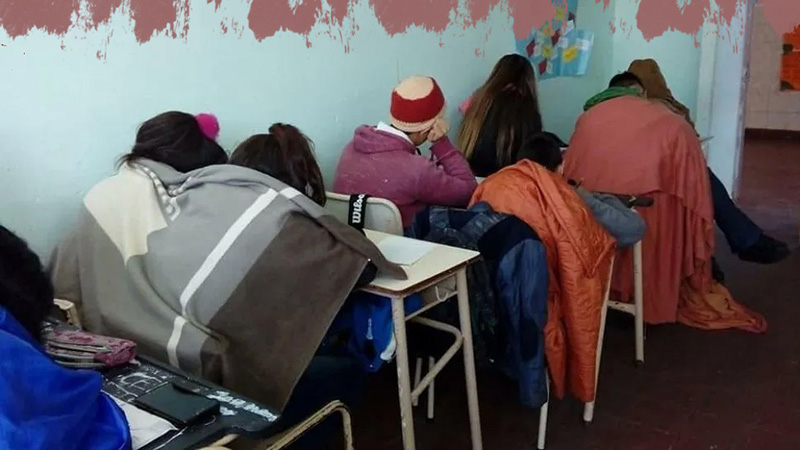 Los adolescentes que apuestan al nivel medio en la educación pública van con frazadas a la Escuela 33 de Mar del Plata. Donde el viento marino hace intratables los inviernos. Porque no hay calefacción. Y porque tienen las ventanas cerradas con cartones. Sin vidrios. Las puertas, dice la directora, no concuerdan con los marcos. Se llevan decididamente mal. Por eso todos andan con una tijera en el bolsillo para destrabar la que no se puede abrir y dejó encerrados a los alumnos o a los docentes.