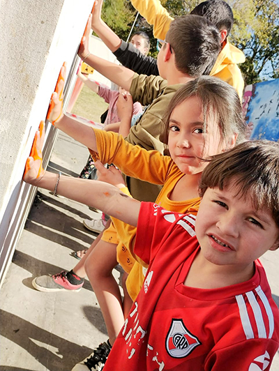Las chicas y los chicos dejan grabadas sus manos en lo que quedó del quincho