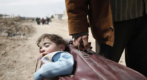 Un niño duerme en una valija que carga su papá, tratando de salir de Siria.