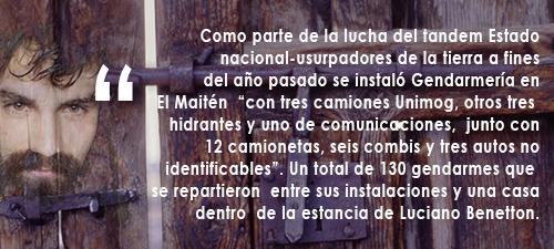 Mientras la pregunta sobre el destino de Santiago es respondida con silencios, el periodista Ricardo Ragendorfer desentraña la existencia de un documento parido a mediados de 2016 después de tres cónclaves entre representantes securitarios del Ejecutivo y la Sociedad Rural de Chubut, Río Negro y Neuquén. Los originarios –garantiza- “se proponen imponer sus ideas por la fuerza con actos que incluyen la usurpación de tierras, incendios, daños y amenazas”. Y afectan “servicios estratégicos de los recursos del Estado, especialmente en las zonas petroleras y gasíferas”. Como parte de la lucha del tandem Estado nacional-usurpadores de la tierra a fines del año pasado se instaló Gendarmería en El Maitén “con tres camiones Unimog, otros tres hidrantes y uno de comunicaciones, junto con 12 camionetas, seis combis y tres autos no identificables”. Un total de 130 gendarmes que se repartieron entre sus instalaciones y una casa dentro de la estancia de Luciano Benetton.