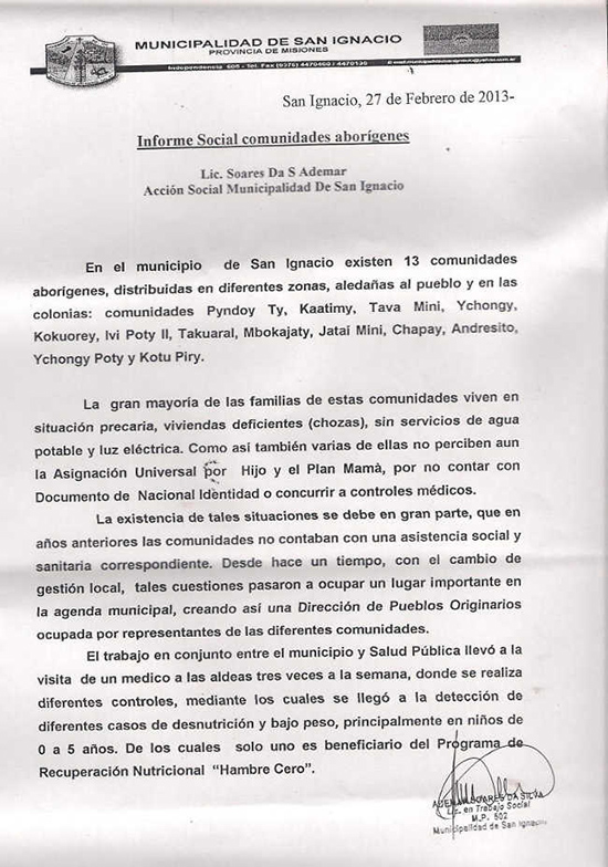 Completaba la documentación probatoria , un Informe Social de Comunidades Aborígenes elaborado por la Municipalidad de San Ignacio también en febrero de 2013, donde se explicita que a pesar de la existencia de 103 desnutridos en las aldeas, y de haberse solicitado al Ministerio de Derechos Humanos de la Provincia la inclusión de estos niños desnutridos al Programa Nutricional Hambre Cero – que obligatoria e inmediatamente debió haberlos incluido – solamente uno de estos niños está recibiendo la asistencia de dicho programa. Los demás, no solo se quedaron sin ser incluidos en el Hambre Cero, sino que además fueron invisibilizados adrede por ese programa, que a pesar de estar al tanto, no activó ninguna ayuda y decidió esconder a la sociedad la existencia de los casos.