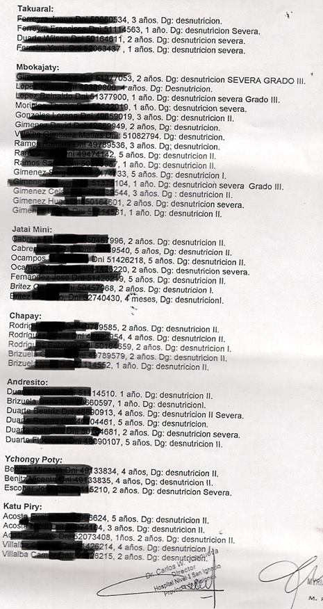 De este modo, los intentos por ocultar la pobreza estructural y especialmente la desnutrición infantil (camuflada muchas veces bajo el eufemismo “bajo peso”), se volvieron parte de una estrategia deliberada. Un caso que refleja a las claras lo enunciado anteriormente, ocurrió en 2013, cuando la Revista Superficie (un medio alternativo de la provincia) dio a conocer un informe basado en un documento oficial firmado por el director del hospital de San Ignacio, Carlos Villanueva y por la médica Myriam Piriz, fechado el 27 de febrero de 2013, que daba cuenta de la existencia de 103 niños en estado de desnutrición en las 13 comunidades mbya de esta localidad misionera.