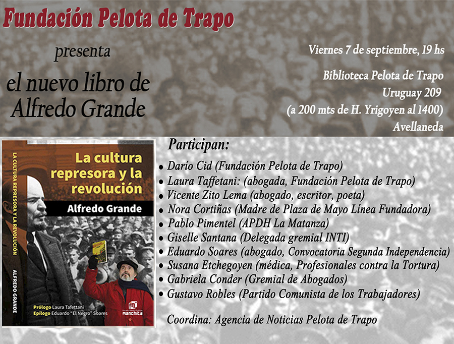 (APe).- Parir un libro en papel en estos tiempos es casi un acto revolucionario. En este caso, coincide, además, con el contenido. “La batalla cultural, como afirmación, me pareció siempre verdadera, pero insuficiente”, afirma Alfredo Grande en su nuevo libro “La cultura represora y la revolución”. “Primero porque no es batalla, sino una guerra. La masacre permanente a todas las formas de subjetividad deseante, desarrollada y perfeccionada en siglos, es incorporada y naturalizada o es resistida y atacada. La declaración de guerra contra todas las formas de cultura represora es necesaria. El anatema de la guerra, de toda guerra, es otro de los trucos de la cultura represora”. Allí, a lo largo de 480 páginas analiza estos tiempos de “parálisis motora y de indiferencia afectiva”. Tiempos de lo que deben devenir –aunque no siempre ocurre- “actos justos”.Se conjugan textos ya publicados en APe con otros artículos inéditos.