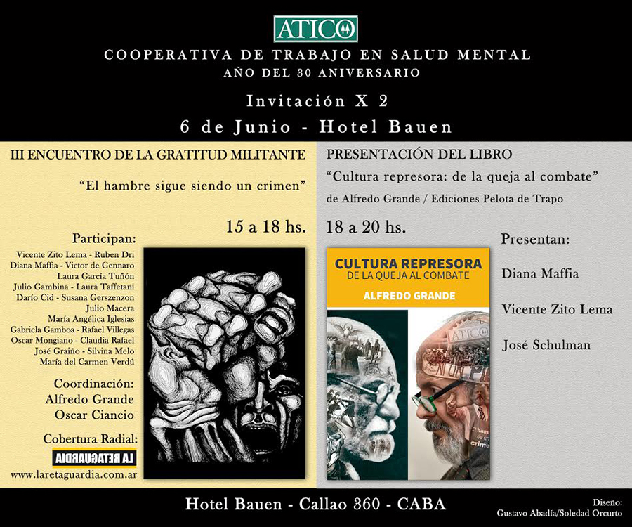 El 6 de junio a las 15 horas nos encontramos en el BAUEN todos los que consideramos, los que militamos sin militarizarnos, que con ternura venceremos. Y en ese marco voy a presentar mi tercer libro editado por APE: “La cultura represora”. Porque también yo necesito expresar mi propia gratitud militante con la Fundación Pelota de Trapo, con la cooperativa ATICO, y con tantos compañeros y hermanos en lucha que con no demasiado esfuerzo, también los puedo contar.