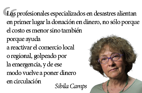 Lxs profesionales especializadxs en desastres alientan en primer lugar la donación en dinero, no sólo porque el costo es menor sino también porque ayuda a reactivar el comercio local o regional, golpeado por la emergencia, y de ese modo vuelve a poner dinero en circulación; fue lo que con buen tino se decidió hace poco, con los incendios en la zona de El Bolsón.
