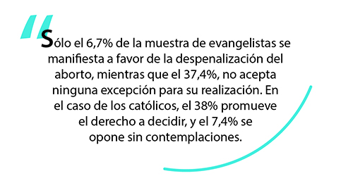 En una encuesta (2009) realizada por Fortunato Mallimaci, Juan Cruz Esquivel y Verónica Giménez Béliveau para el CONICET, titulada “Creencias religiosas y estructura social argentina en el siglo XXI”, se verifica la pertenencia religiosa como un factor gravitante en la opinión frente al aborto. Según esta encuesta, si en el caso de la población en general los porcentajes entre quienes sostienen que el aborto debe estar siempre prohibido y quienes creen que debe estar permitido sin excepciones son similares, en el caso de los evangelistas con respecto a los católicos, las diferencias se evidencian. Sólo el 6,7% de la muestra de evangelistas se manifiesta a favor de la despenalización del aborto, mientras que el 37,4%, no acepta ninguna excepción para su realización. En el caso de los católicos, el 38% promueve el derecho a decidir, y el 7,4% se opone sin contemplaciones.