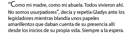 Detrás del desalojo de esta semana hay un sufrimiento humano del que los gobiernos no suelen hacerse cargo. Por el contrario, arman (como armaron) una parafernalia represiva propia de estos tiempos para enfrentar a un grupo de familias y barrerlas con todas las herramientas del poder de los espacios que les interesan gestionar, en el grueso de los casos, para beneficio del mercado inmobiliario. Por la sencilla razón de que los protagonistas son los eternamente expulsados que simplemente desean como se desnuda en el grito solapado de Gladys Correa una casita en la que vivir, que pagar con su jubilación y su trabajo, con el inalcanzado sueño de sábana y mantel.