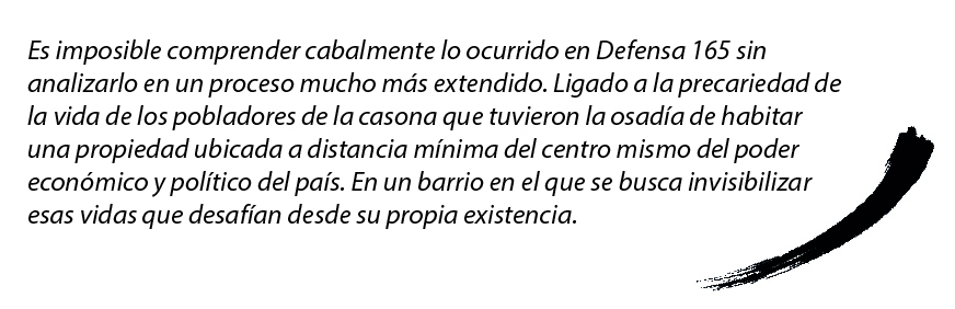 Es imposible comprender cabalmente lo ocurrido en Defensa 165 sin analizarlo en un proceso mucho más extendido. Ligado a la precariedad de la vida de los pobladores de la casona que tuvieron la osadía de habitar una propiedad ubicada a distancia mínima del centro mismo del poder económico y político del país. En un barrio en el que se busca invisibilizar esas vidas que desafían desde su propia existencia.