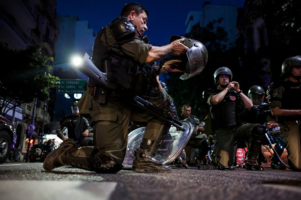 Hay ciertas calles que adquirieron violentamente el tinte verde o el azul de las fuerzas de seguridad. Mientras el Estado argentino entrega su propia dote a los marioneteros del capital: ofrece riquezas naturales, entrega los recursos de la Pachamama, garantiza ilimitada liberalización del mercado, asegura que no habrá obstrucciones a los planificadores de blancos guantes que jamás se manchan sus ropas ni sus cuerpos.