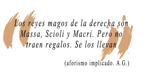Scioli es el más perfecto Salieri de Menem. No el único, pero el que estuvo donde no tenía que estar, y el que desean que no esté donde tendría que estar. Con Scioli el kirchnerismo sólo puede aspirar a ser menemismo de derecha, justo castigo porque nunca decidió ser algo más que menemismo de izquierda. La tóxica cultura del mega consumo no fue desterrada, sino que se la considera el pilar de la economía. Inducir a endeudarse en 12 cuotas es una perversa forma de sostener la cultura del trabajo. El personaje del año es “Moscardelli”, un psicótico cuyo delirio es el dinero. La sugerencia es que para “curarse”, pruebe con “quiniela plus”. La década no se ganó: se rifó.