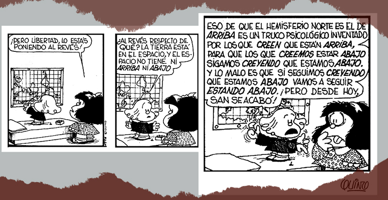 Yo diría que Mafalda había logrado una ceremonia de resucitación, al decir de Vicente Zito Lema, de una comunista que era su abuela. Mafalda no era una niña comunista. La genialidad del genio fue distribuir en cada entrañable personaje la crítica y lo criticado. Y digo crítica y no reproche, porque el pensamiento crítico aclara y no oscurece, y el reproche termina en castigo. Mafalda sostenía un pensamiento crítico e irónico. Es una militante del humor permanente. Solamente un niño puede decir que “el rey está desnudo”. Y que la cultura burguesa, tapada de visones, armiño y lamé, tenía que ser desnudada. Pero había dos claves en esa estrategia. Una me la anticipó mi padre. No estuve de acuerdo, pero debo mencionarlo porque Quino lo afirma. “una cosa inteligente dicha por un adulto no tiene ninguna gracia, mientras que si la dice una niña todo cambia". La misma cultura represora que trató siempre a niñas y niños como infradotados, no tenía defensas frente a la penetrante lucidez de Mafalda. Apenas una lamentable escapatoria que consistía en reírse por no llorar. Y menos pensar.