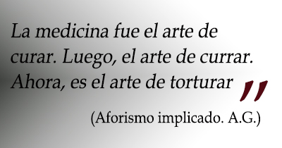 Verdugos de toda alegría, de todo amor, de toda bienaventuranza. Son femicidas por goteo y por derrame. No quieren dos vidas. En realidad, lo que anhelan son dos muertes. Obviamente, con esos médicos tengo algo muy personal. Recuerdo cuando me recibí, mi hermana me regaló un cuadro con este texto atribuido a Esculapio: “si te juzgas pagado lo bastante, con la dicha de una madre, con una cara que sonríe, porque ya no padece, con la paz de un moribundo, a quien ocultas la llegada de la muerte, si ansias con hacer al hombre, penetrar todo lo trágico de su destino, entonces, ¡hazte médico, hijo mío!”