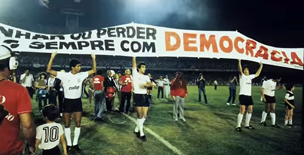 Por iniciativa del publicista Washington Olivetto (vicepresidente de marketing del club en ese momento, y uno de los creadores del término "Democracia Corinthiana", junto con el periodista Juca Kfouri) el club estamparía en su vestimenta consignas a favor de la democracia, como "diretas-já" ("elecciones ya") o "eu quero votar para presidente" ("quiero votar para presidente"). Esto tuvo lugar durante la última dictadura militar, cuando los movimientos sociales comenzaban a rearticularse para la conformación de una democracia. Democracia Corinthiana causó malestar entre los militares quienes, a través del brigadier Jerônimo Bastos, pidieron moderación en el club.
