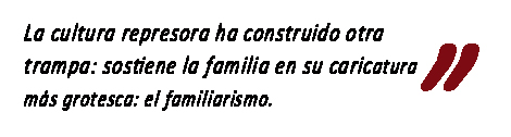 Los secretos que todos conocen, pero de los que nadie habla, van modelando una subjetividad sometida. La palabra “familia” no es solamente una forma de referirse a las estructuras elementales de parentesco, sino que ha sido ritualizada como un valor. Un restaurante publicita: “ambiente familiar”. Nunca se me ocurrió entrar porque me consta que hay familias con ambientes inmundos. Otros que pretenden seducir: “coma como en su casa”. Obviamente, para comer como en mi casa no se me ocurriría ir a un restaurante.