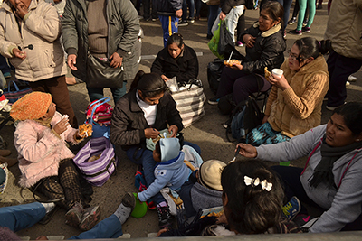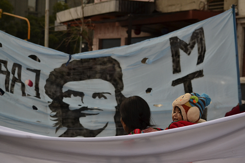 Un vendedor de sanguches hace los dedos en ve y el hombre con la canasta de chipá sobre la cabeza se mueve plásticamente sin usar las manos. El grito de los marchantes pronuncia los nombres de Darío y Maxi y los hermana en sus historias con los miles y miles faltan. Que son ausencia eterna. En cada década y en cada era.