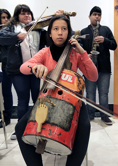 Ada Ríos Bordados tiene 13 años y toca el violín. Su instrumento fue hecho con latas, sumideros de duchas, tenedores viejos y monedas. “No cambiaría este instrumento por otro. Tiene un sonido único y que me encanta. Vivir al lado del basural siempre fue un problema y algo feo para nosotros. Pero desde que existe la Orquesta todo es diferente” dice Ada.