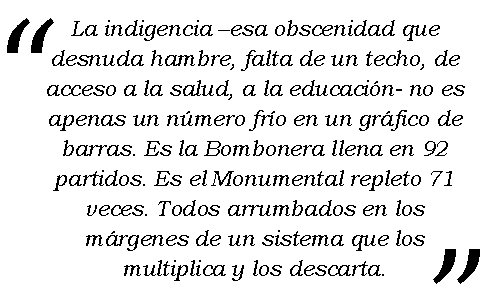 La indigencia –esa obscenidad que desnuda hambre, falta de un techo, de acceso a la salud, a la educación- no es apenas un número frío en un gráfico de barras. Es la Bombonera llena en 92 partidos. Es el Monumental repleto 71 veces. Todos arrumbados en los márgenes de un sistema que los multiplica y los descarta.