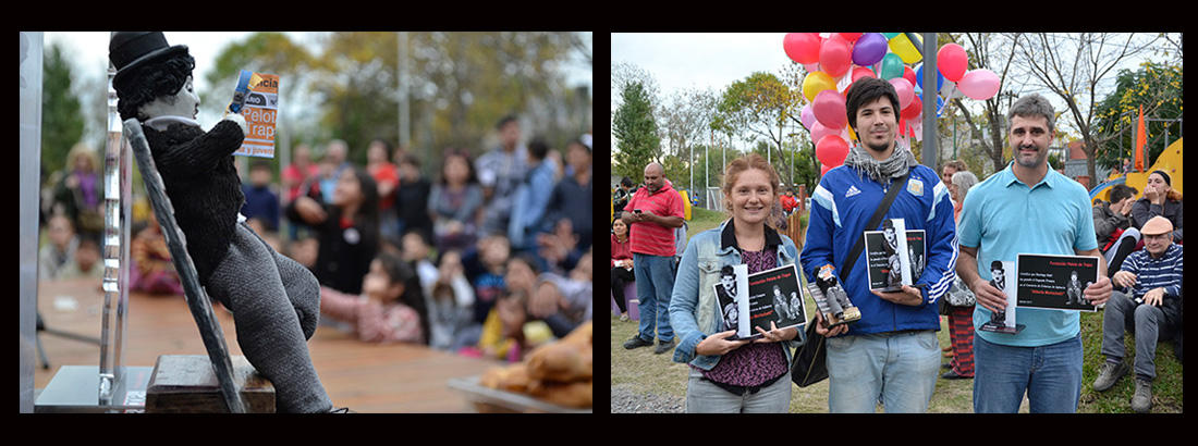 Un bellísimo Chaplin realizado por Verónica González para el primer premio del Concurso de Crónicas de Infancia Alberto Morlachetti. Los tres ganadores, presentes en la fiesta del 22 de abril en el Recreo Pelota de Trapo: