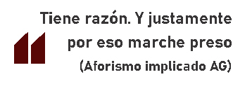 Obviamente, la razón que te hace marchar preso, es la razón revolucionaria. La razón reaccionaria te da varias zonas de confort. Todo esto viene a cuenta de que un periodista politólogo al que considero muy capaz, dijo varias veces que “el hambre siempre tiene razón”. La asociación libre es poderosa. “Pero marche preso” pensé inmediatamente. Y luego, ya no tan libremente, seguí pensando: “¿qué es en la actualidad de la cultura represora ir preso?” Privado de su libertad, se decia en una época. Entonces todos los que están privados de alguna libertad, están presos. Privados de la libertad de comer por ejemplo.