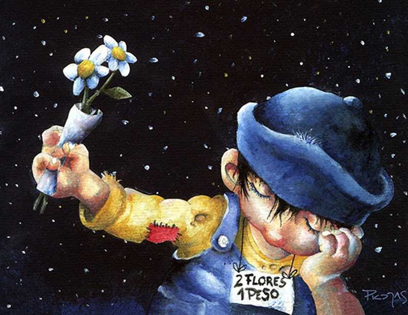 El niño que vende flores bajo un cielo rebosante de estrellas es una de sus ilustraciones más amadas.